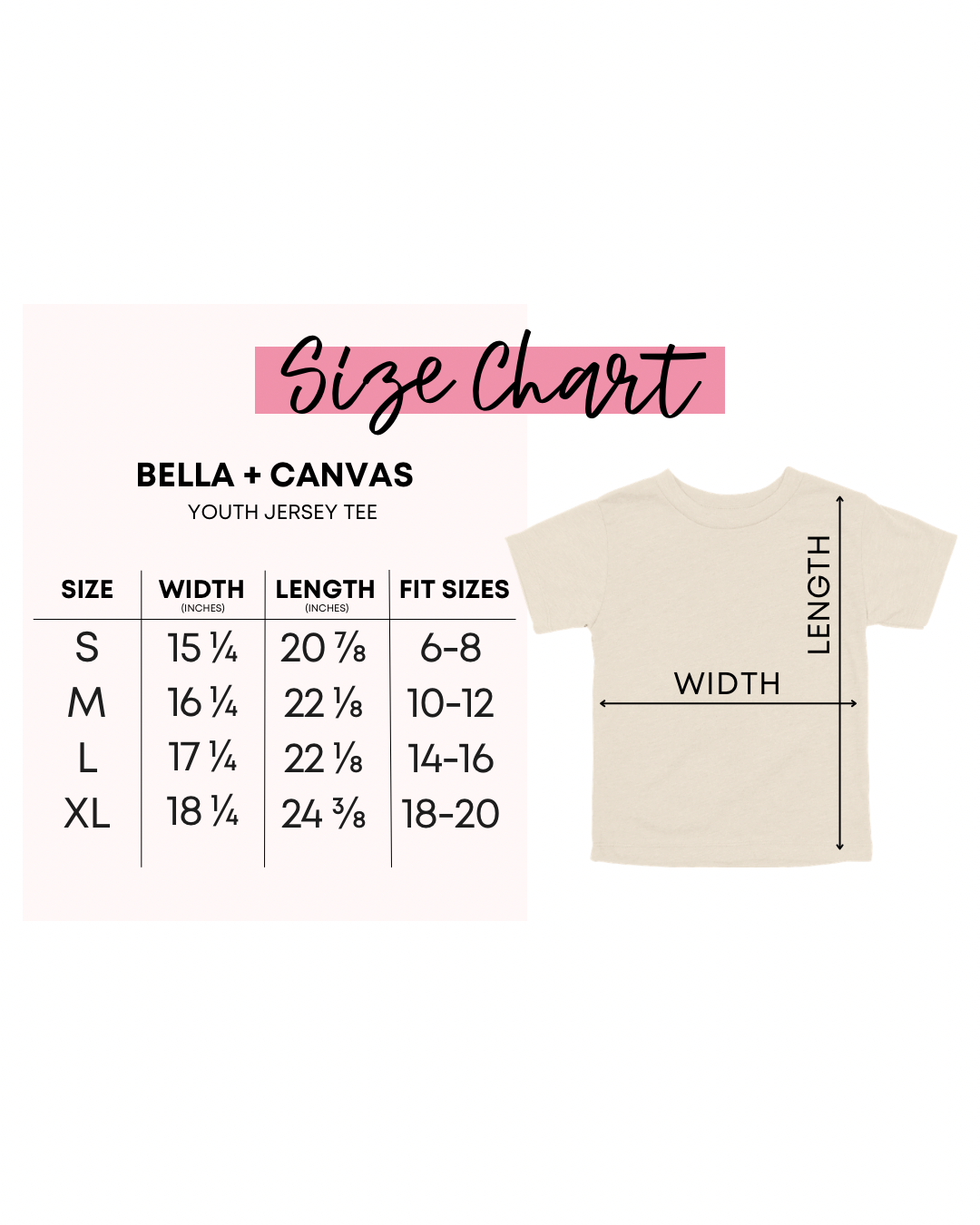 Fabric content: Bella + Canvas youth tee. 100% Airlume combed and ringspun cotton, super soft and lightweight. Unisex fit and true to size. Size up for an oversized fit.