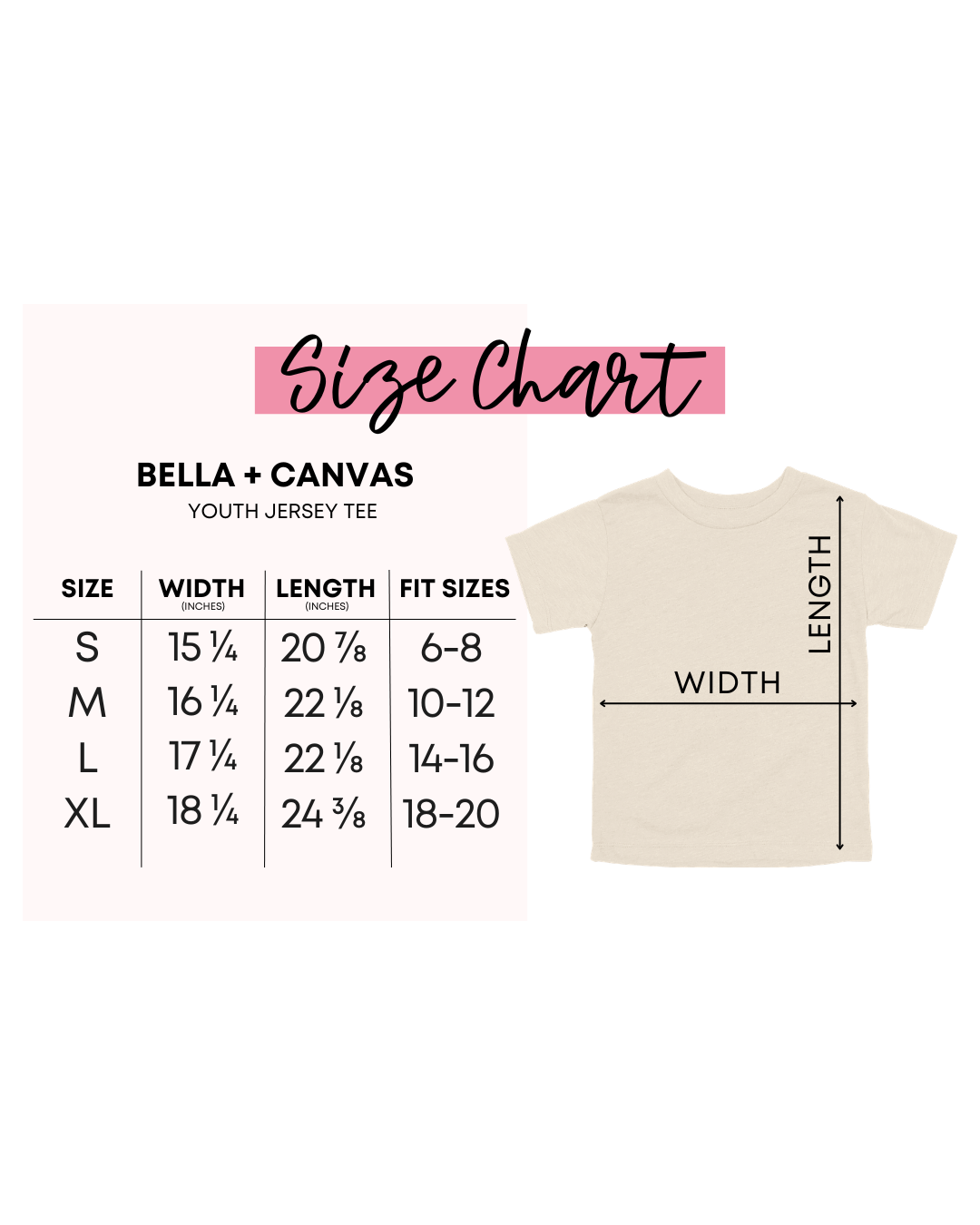 Fabric content: Bella + Canvas Youth Tee (White, Natural, Athletic Heather, Pink, Green) 100% Airlume combed and ringspun cotton, super soft and lightweight. Unisex fit and true to size. Size up for an oversized fit.