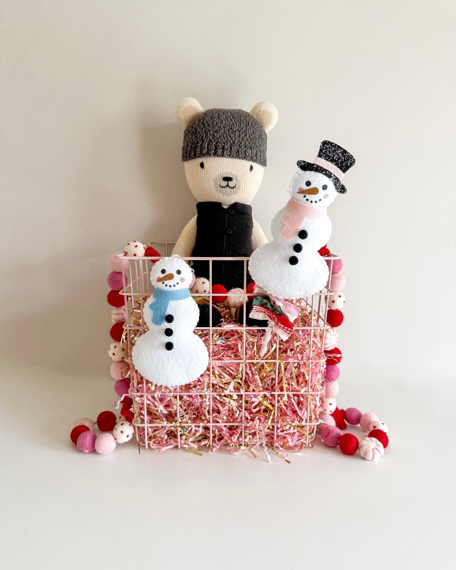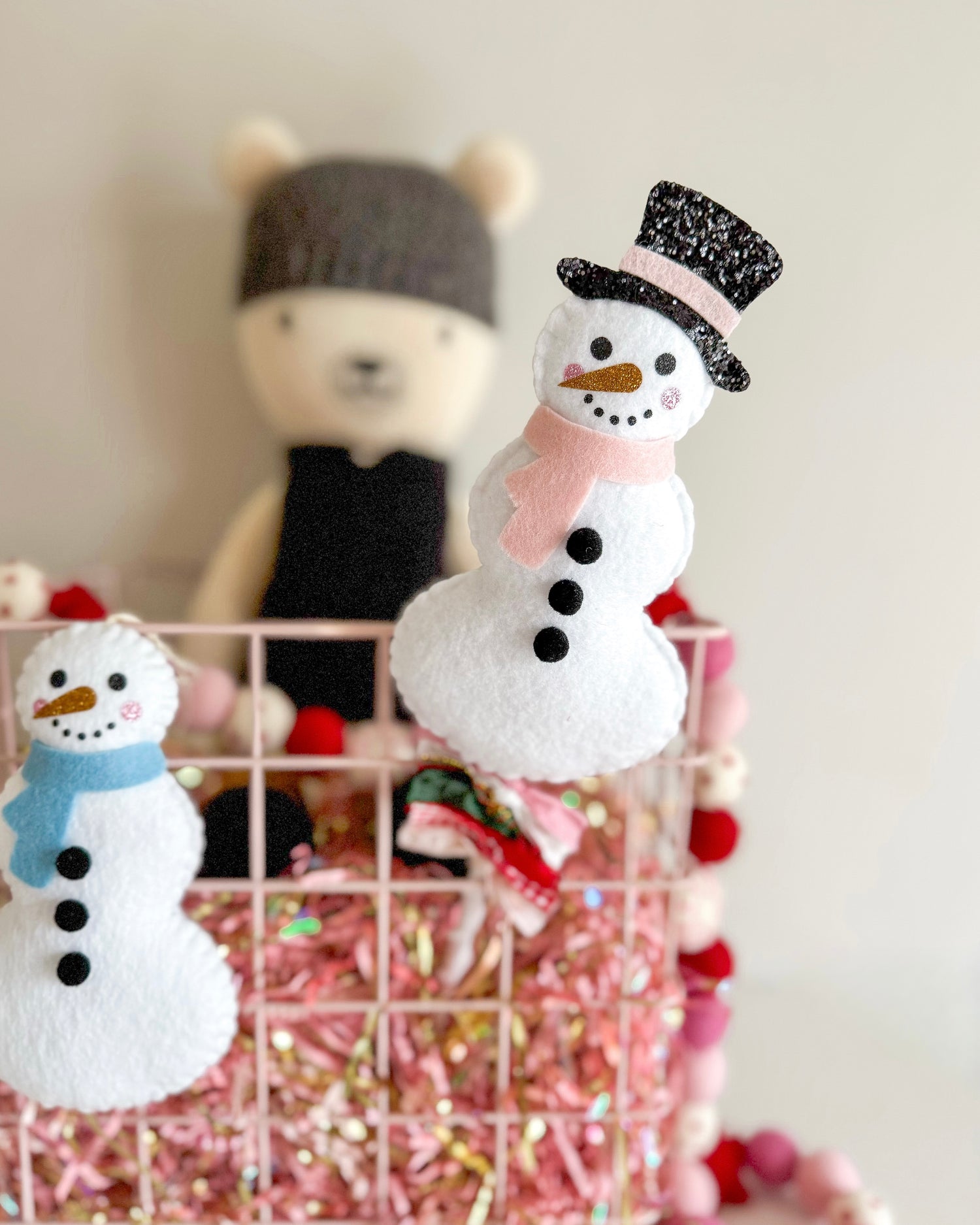 Hand sewn felt snowman. Use as an ornament, present topper, basket tag, or as decor by hanging on walls, shelves, and hooks. Wand should be used for decor purposes only.