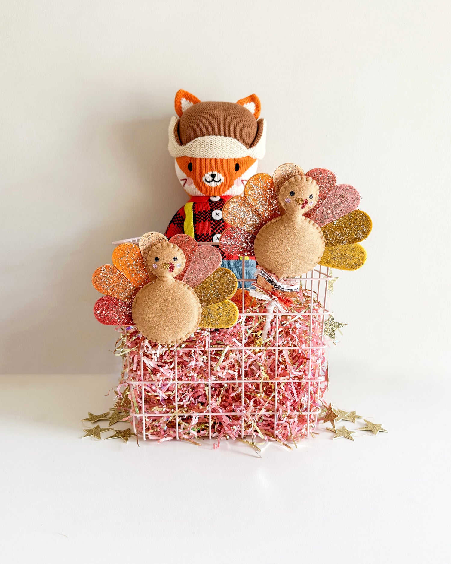 Hand sewn felt turkey. Use as an ornament, present topper, basket tag, or as decor by hanging on walls, shelves, and hooks. Wand should be used for decor purposes only.